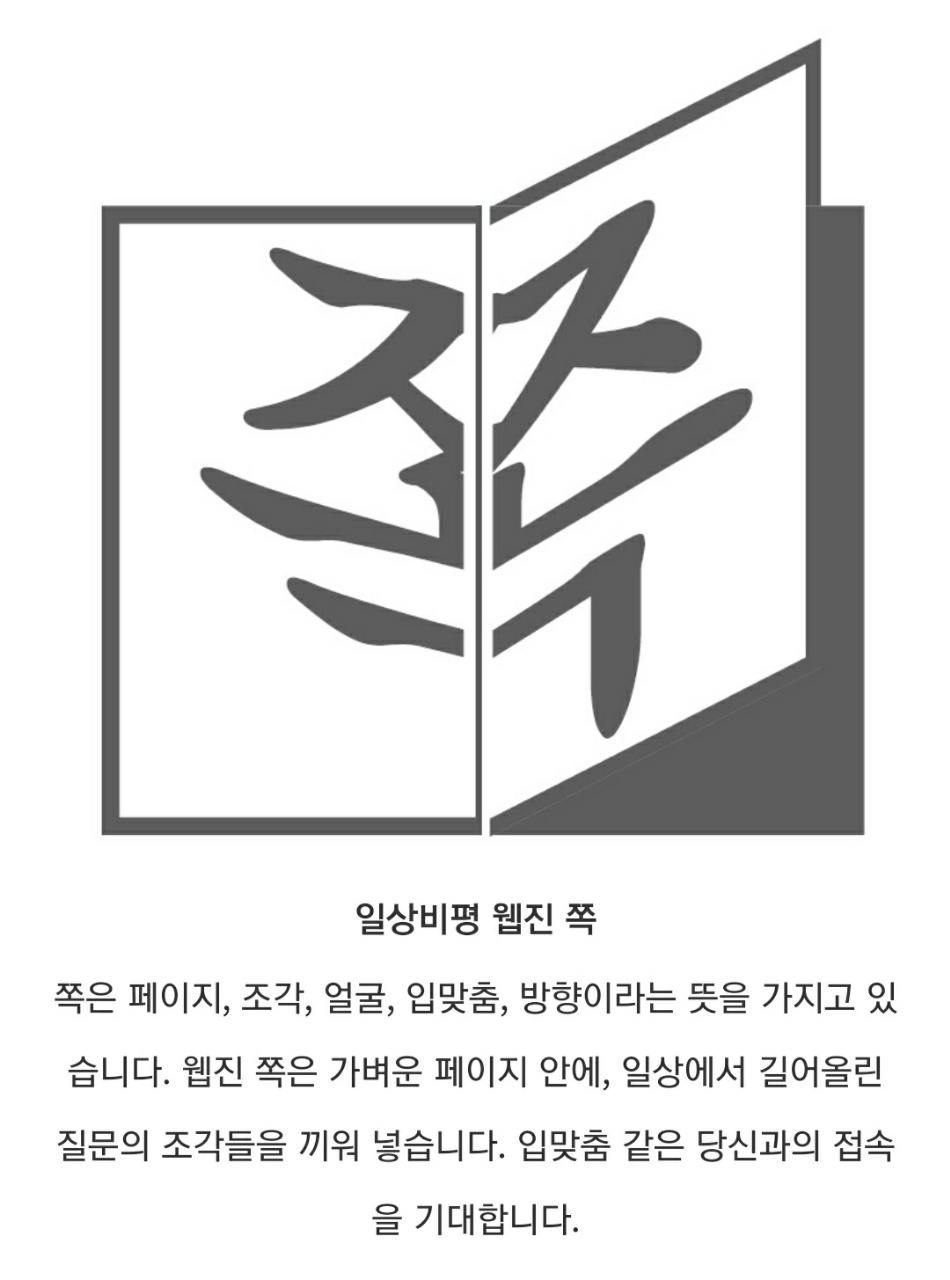 일상비평 웹진 《쪽》은 페이지, 조각, 얼굴, 입맞춤, 방향이라는 뜻을 가지고 있습니다. 웹진 《쪽》은 가벼운 페이지 안에, 일상에서 길어올린 질문의 조각들을 끼워 넣습니다. 입맞춤 같은 당신과의 접속을 기대합니다.